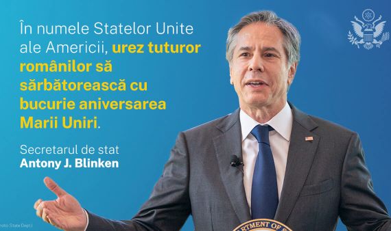 Suntem mândri să colaborăm cu România pentru a face față provocărilor globale și pentru a asigura prosperitatea și bunăstarea popoarelor noastre. Felicitări cu ocazia Zilei Naționale!“, este mesajul transmis de către Secretarul de stat al SUA, Anthony BLINKEN.