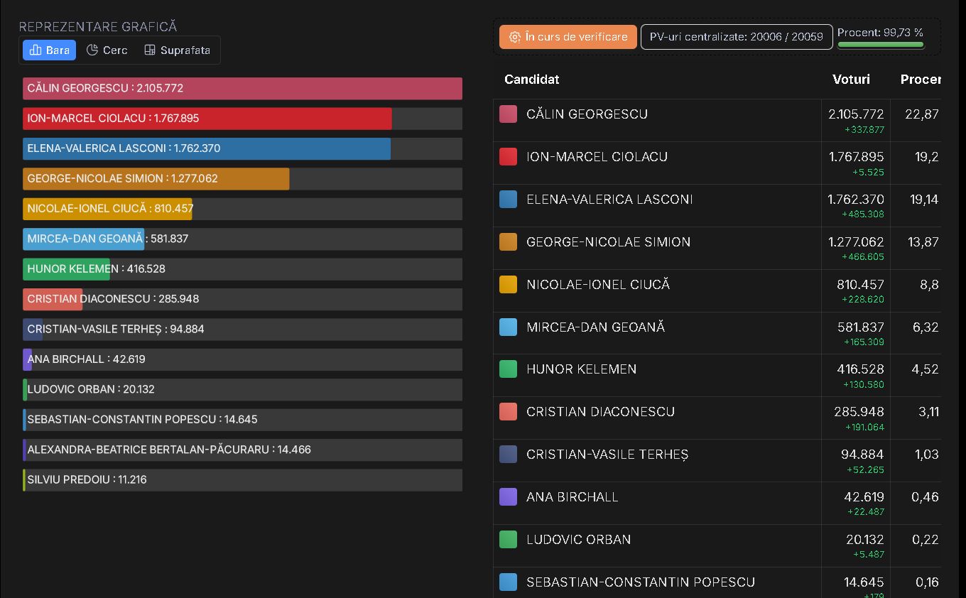 * Independentul Călin GEORGESCU a câștigat primul tur al alegerilor prezidențiale cu un scor de 22,86% după centralizarea a 99,76% a proceselor verbal din secții * Cel mai probabil, adversarul său în turul 2 este Marcel CIOLACU (PSD) care a obținut 19,2% din voturi * Elena LASCONI, pe locul 3 la doar câteva mii de voturi de Marcel CIOLACU * Nicolae CIUCĂ abia pe locul 5! * Marjă mare de eroare la exit poll!!! * Săptămâna viitoare avem alegeri parlamentare și rămâne de văzut unde se vor duce voturile lui Călin GEORGESCU!!! *